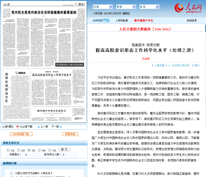 12月2日,《人民日报》在7版理论版,刊发校党委宣传部部长王金海的文章《强基固本 锐意创新——提高高校意识形态工作科学化水平(治理之道)》。