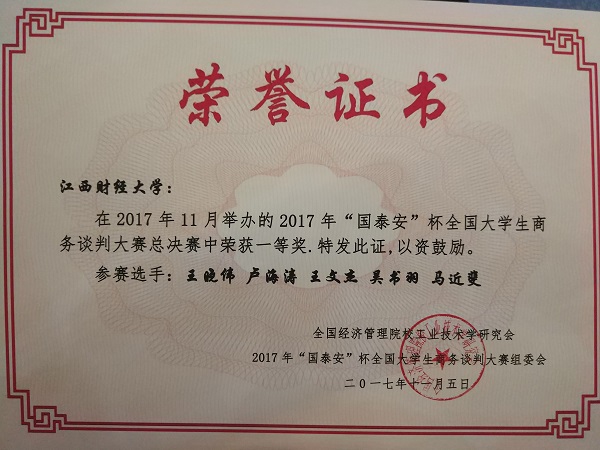 11月4日至5日,2017年“国泰安”杯全国大学生商务谈判大赛总决赛在京举行。经过两天激烈的角逐,由我校2015级MBA王晓伟、2017级企业管理专业硕士研究生卢海涛、2015级本科生王文杰、吴书羽以及2016级本科生马近斐组成的“方圆队”以优异的成绩荣获总决赛一等奖,这也是我校代表队第二次获得该赛事总决赛一等奖。工商学院汪华林副教授、胡海波教授获得“优秀指导老师”称号,王晓伟获“优秀谈判手”称号(全国仅6名)。