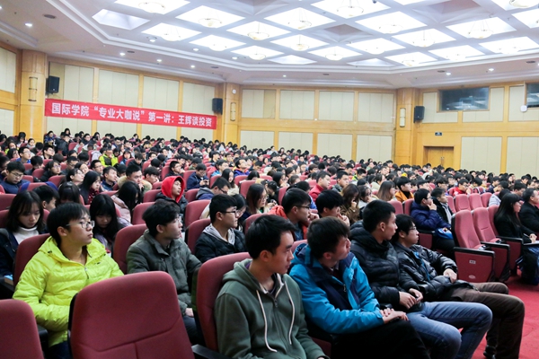 “王辉老师讲投资,幽默不枯燥,结合了实际的故事和案例,让我们意犹未尽!”“虽然具有专业的高度,但即使专业基础不好也能够完全听懂。”“我身边听了讲座的同学都热血沸腾,下个学期选王老师的课得拼手速啦!”12月16日晚,蛟桥园北区国际学术交流报告厅里人头攒动、座无虚席,国际学院“‘专业大咖说’第一讲:王辉谈投资”在这里举行。国际学院副院长陈卫东、教师代表与来自2015、2016级国际金融专业的四百余名学生一起,共同聆听了金融学院王辉教授带来的的专题讲座。