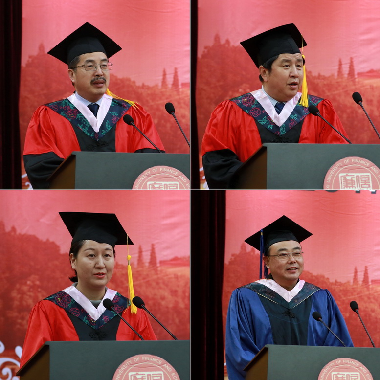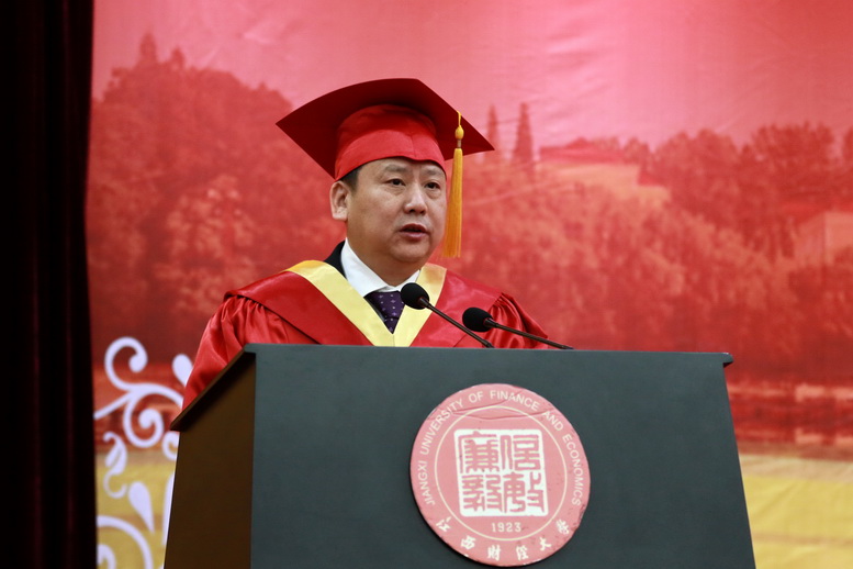 卢福财代表学校对全体毕业生表示了祝贺,向辛勤奉献的导师表示了感谢。他讲到,在刚刚过去的2017年,学校在学科建设和研究生教育上都取得了不俗的成绩,“百年名校”建设获得了一系列丰硕成果。作为处在我校这一重要发展时期的毕业生,他对大家提出了几点希望。首先要不忘初心,志存高远。要树立不畏艰难、锲而不舍的精神,做一个坚忍不拔、自强不息之人,做一个敢于担当、胸怀家国之人。其次要终身学习,眼界宽广。毕业并不意味着学习的结束,而是另一段求学的开始,只有与时俱进,刻苦钻研,才能不断提升自己的价值。再次要勇于创新,奉献社会。要时刻牢记“信、敏、廉、毅”的校训和“敬业乐群、臻于至善”的江财精神,与时代同频共振,勇立潮头,奋勇前进。
