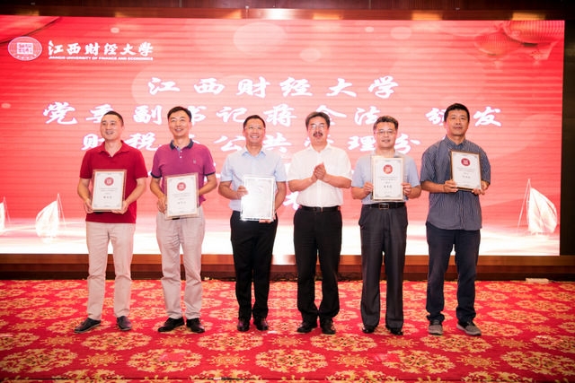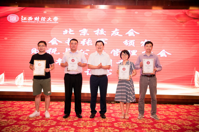 蒋金法为校友分会会长曾玉柏(1988级税务),副会长王家亮(1987级财政)、林郁文(1988级财政)、焦亚伏(1989级国资)、樊应超(1994级税务)颁发聘书。