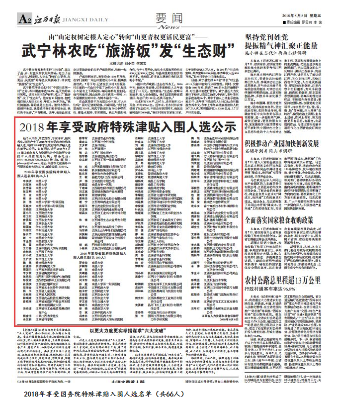8日,省人力资源和社会保障厅在江西日报A2版发布了《2018年享受政府特殊津贴入围人选公示》。经逐级推荐选拔,专家评审和组织考察,共确定江西省2018年享受国务院颁发政府特殊津贴人员入围人选66名。我校匡小平教授、章卫东教授入选。