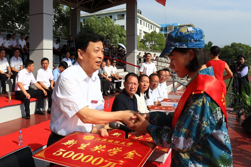 典礼上,校党委副书记蒋金法宣读了2018级新生奖学金表彰决定。在2018年全国普通高考中,一批优秀学生报考我校。根据《江西财经大学普通本科吸引优质生源奖励承诺实施办法》,经学校研究,决定对曾双双、曾凡麟、李欣阳等201名同学予以表彰,并发放“新生奖学金”。其中,曾双双获得新生奖学金5万元。希望受表彰的同学谦虚谨慎,戒骄戒躁,继续保持优良学风,争取更大成绩;其他同学应以获得“新生奖学金”的同学为榜样,认真学习,努力奋进。全体新同学要努力成为具有“信敏廉毅”素质的创新创业型人才,为学校建设基础厚实、特色鲜明、人民满意、国际知名的高水平财经大学,实现“百年名校”江财梦而努力奋斗。