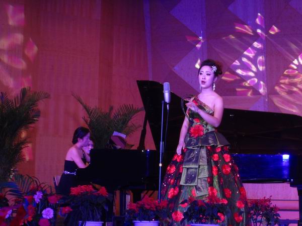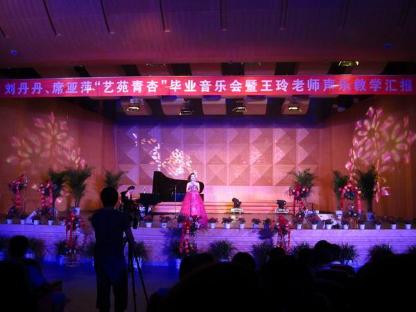音乐会由08级王舒同学担任钢琴伴奏,音乐会在富有激情的琴声中开始,刘丹丹演唱的《长相知》的旋律虽然婉转悠扬,但感情却悲壮慷慨、壮怀激烈;《飞蛾》以其极强的艺术魅力、极深的思想内涵给人以深深的震撼和感染;《枫桥夜泊》旋律婉转,音乐形象生动又具文学性;《永远的花样年华》中以灵巧的声线将歌曲演唱的有声有色;《寻找楼兰》中又以时而高亢激昂,时而低沉舒缓的歌声表达了对古国的思念。