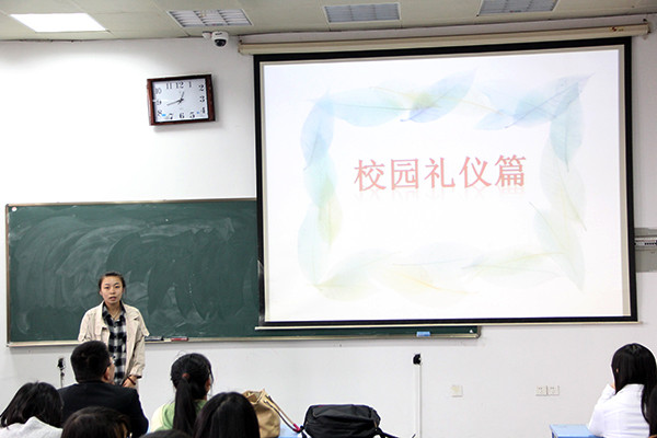 2014年11月5日,由国际学院女生部承办的“文明天使”礼仪宣讲会首场宣讲在南区一教1202顺利举行,出席并担任此次宣讲会主讲的是女生部部长拉妍及团学办公室部长姚雪鸣。