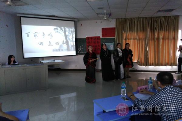 活动伊始,学院14级学生干部介绍了到场的嘉宾,致开奖词,宣布评比规则,评比正式开始。首先由13级各班代表进行限时八分钟的演讲,演讲内容层次分明,语言慷锵有力,赢得了在场观众的阵阵掌声。随后,由14级班级代表上台演讲。虽然,有些代表在演讲之初略显紧张,但是,当讲到自己班级的特色与上一学年的成果时,对班级的自豪之情自然而然的流露出来,之前的紧张之感也荡然无存。最终,旅游141班代表别出心裁,扮演古人,从“道”,“儒”,“法”,“墨”四个角度来介绍本班的文化,而管科142班代表从学年加权,团学工作,学生追梦角度来介绍本班特色,分别赢得了评比的第一与第二名。