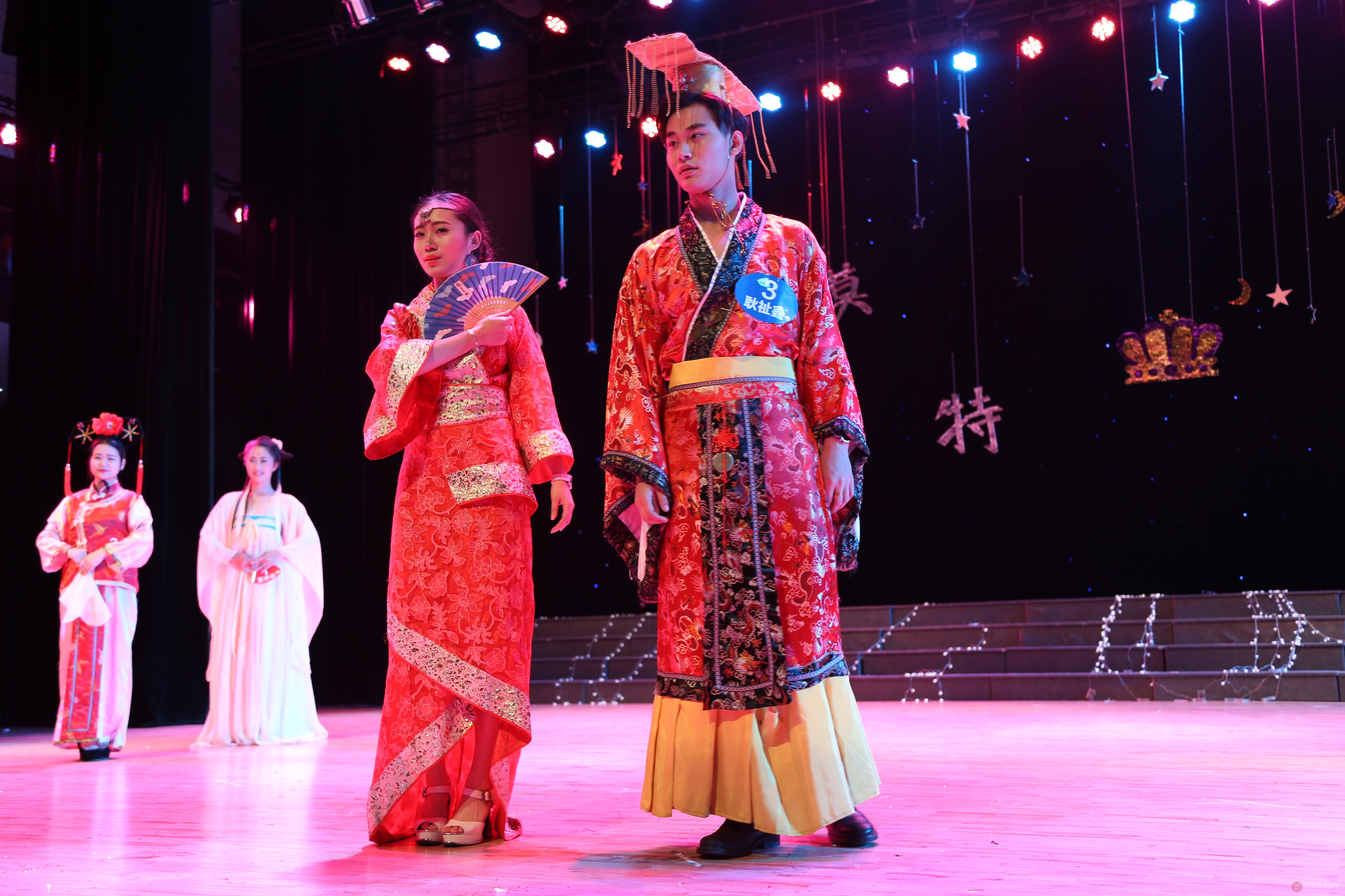 第二环节是来自13个学院36名候选人的模特t台秀。通过复赛的18组选手,分组进行自我风采展示,向大家展示当代大学生的青春向上的风采。最后一个环节是中西文化秀,36位选手分成六组。第一组给观众展示了中国古风之美,通过皇帝,宫女,侠客,仙女等古装人物的扮演,给大家直观的展示汉服的魅力。接下来一组同学,真实的还原了抗战时期上海滩的烟火风云,在抗日战争胜利70周年之际,缅怀先烈和志士。“一代天骄,成吉思汗,只识弯弓射大雕”,选手们给舞台带来了属于塞北少数民族的豪放与真诚。看完了中国,选手们又将我们带入了西方世界。属于新航路开辟的大航海时代,海盗军官等人物;来自西班牙的经典人物热情的弗朗明哥和卡门;神秘的阿拉丁神灯和曼妙的波西米亚风情。