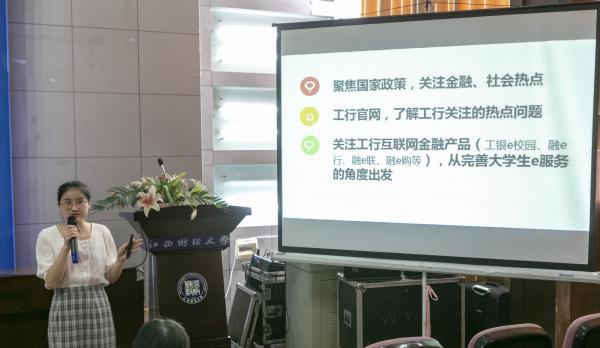 会上,上届大赛中荣获全国区域决赛三等奖、江西省赛区一等奖的作品《工行融E联APP增进项目平台一融易险》的团队代表钟绚芳同学做了产品展示并进行经验分享。她从产品介绍、创意来源、整体框架及经验分享四个方面详细地展示了从准备阶段到决赛的各项工作,她告诉同学们:比赛的丰厚奖金奖励并不是最诱人的,能代表江西财经大学与国内985、211等高校学生同台竞技,向大家证明江西财经大学和这些高校一样优秀,才是我们参赛的内在动力。