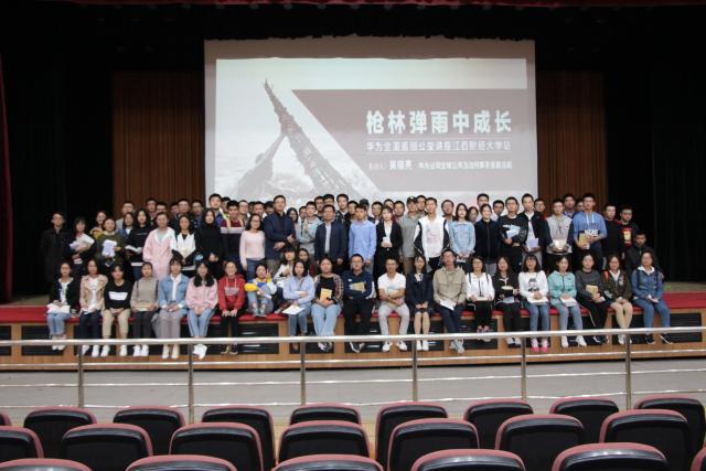吴晓亮和学子们分享了华为“枪林弹雨中成长”的故事以及一些成长经验。他从华为的成长史,任正非的个人经历等事例简单地介绍了华为这一路的磕磕绊绊,以及收获到的认可、荣誉与成就。紧接着,主讲人从华为文化、个人奋斗、企业凝聚力、华为的独特思维等方面展开了详细的叙述。在谈到华为文化,主讲人做了一个很形象的比喻。他说,华为文化就像一个洋葱,要一层层地去剥,剥到最里面,会发现它的核心是以客户为中心。正是客户至上的理念,让华为处处要求精致,最终得到越来越多用户的喜爱。并且,由于领导人任正非的无私,对员工无微不至的关怀,也加强了企业的凝聚力。“炸开金字塔尖,用一杯咖啡吸收宇宙能量”讲座期间,主讲人更是频频引用任正非的金句,现场掌声不断。他说道,当今的世界越来越小,只有不断学习才不会被淘汰。华为因为不断炸开金字塔尖,积极吸收人才,从而促进了自身的成长。
