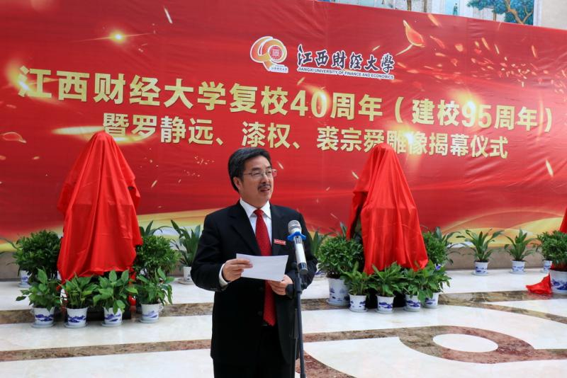 蒋金法致辞。他表示,为已故老领导罗静远、裘宗舜、漆权三位先生设立雕像,是我校庆祝改革开放40周年、复校40周年(办学95周年)的一项重要议题,也是学校文化建设的一件大事。三位老领导都是在江财校史上做出过突出贡献的代表性人物。他们是江财特殊的文化符号,也是激励一代代江财人不断奋进的灵魂导师。为精确再现老领导的容貌与精神,数月以来,校党委宣传部、文明校园建设办公室牵头如期完成了这项文化工程。今天,新老江财人得以隔空对话,共同见证复校40周年的伟大办学成就,意义非凡。