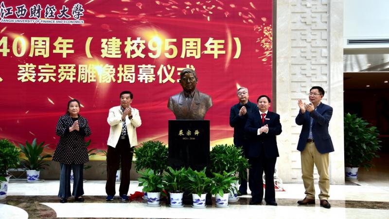 裘宗舜亲属代表裘志琪、裘慧琪,校友代表王志雄、王文京,校长卢福财共同为裘宗舜雕像揭幕。