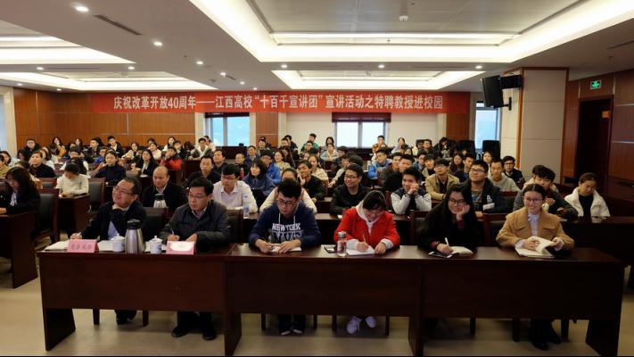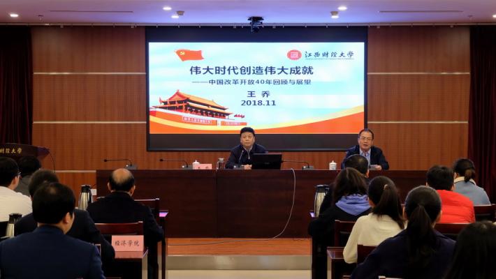 11月15日下午,校党委书记王乔为师生作庆祝改革开放40周年宣讲报告。党办校办主任罗锐主持。这场报告是省委教育工委、省教育厅在全省开展的江西高校“十百千宣讲团”宣讲活动之特聘教授进校园活动的组成部分。