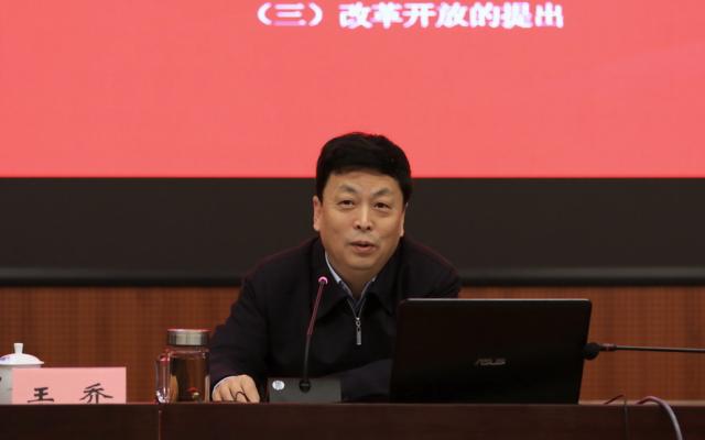 王乔的报告以“伟大时代创造伟大成就——中国改革开放40年回顾与展望”为题,阐述了改革开放的历史背景、发展阶段、带来的历史巨变、经验启示,以及新时代推进改革开放的基本认识,以生动的语言、丰富的资料、翔实的数据展示了改革开放40年的历史进程及取得的巨大成就。报告指出,改革开放40年,推动了以阶级斗争为纲向以经济建设为中心的转变,推动了从计划经济向市场经济的转变,推动中国全方位开放,推动社会主义法治国家建设,极大地改变了我国人民生活图景。40年来,我国经济社会各领域发生了历史性巨变。
