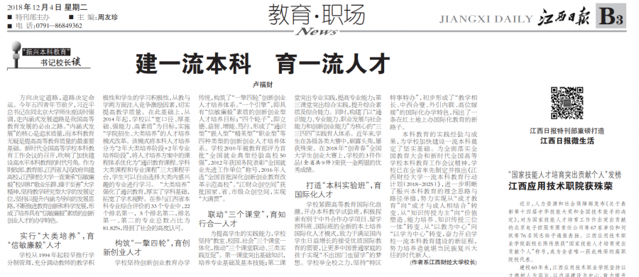 2018年12月4日,江西日报B3版刊登学院校长卢福财理论文章《建一流本科育一流人才》。