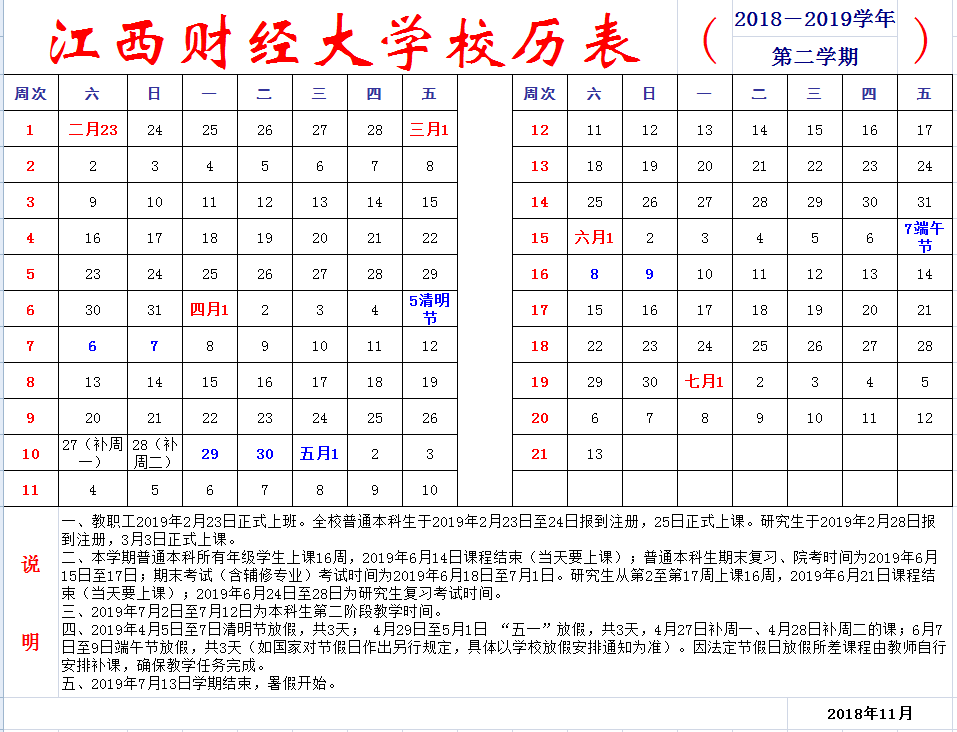 江西财经大学2018-2019学年第二学期校历表新鲜出炉!报到注册、节假日、考试周等重要的时间安排大家千万不要错过哦!还不赶紧下载收藏,好好计划一下新学期的安排吧!