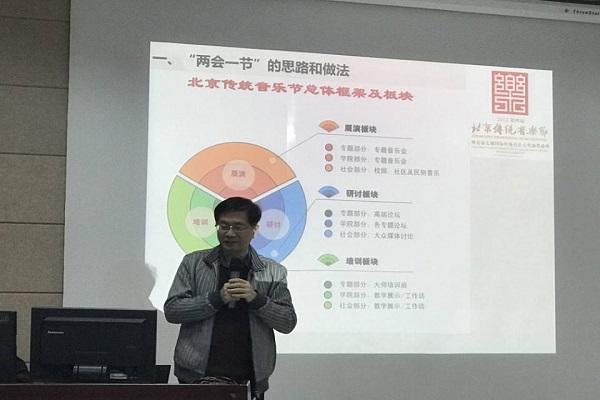 讲座伊始,系主任李二永老师首先致辞,他代表我院向谢嘉幸教授的到来表示热烈的欢迎。谢嘉幸教授此次演讲的主题是高校音乐文化传承与创新,关于两会一节:“下的蛋”平台项目,国家级重点科研项目、省部级重大项目以及以两会一节、一奖为核心开展的国际国内各种学术会议进行了详述。通过对音乐在地方学的特点分析,着重分析了音乐地方学的理论和实践问题,如城市音乐人类学、音乐文化地理学,北京城市的音乐特点、都市与乡村音乐文化进行了讲述,并提出传统音乐文化空间创意资源整合,需要通过资源平台、精品生产、机遇推广、全球集散的方式。