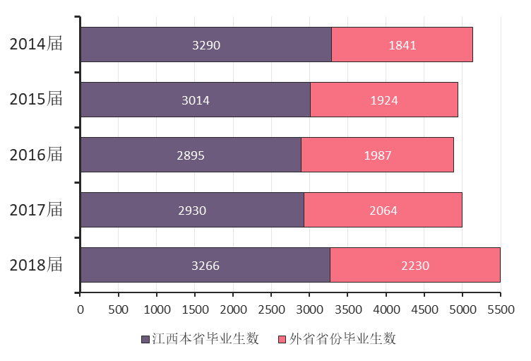 毕业生中江西本省生源3266名,外省生源2230名,外省生源比率较2017届略有下降。