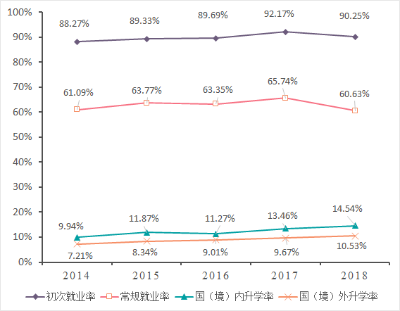 5496名本科毕业生中,4960人实现就业。截止9月1日,本科毕业生初次就业率90.25%,常规就业率60.63%,升学率25.07%。