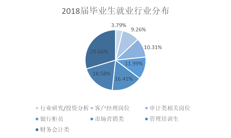 对我校毕业生的就业岗位分析,29.66%的毕业生从事财务会计类相关岗位;18.58%的毕业生工作于管理培训生相关岗位;从事市场营销类相关岗位的毕业生占比16.41%;银行柜员岗位占比11.99%;审计类相关岗位、客户经理岗位、行业研究/投资分析相关岗位分别占比10.31%、9.26%、3.79%。