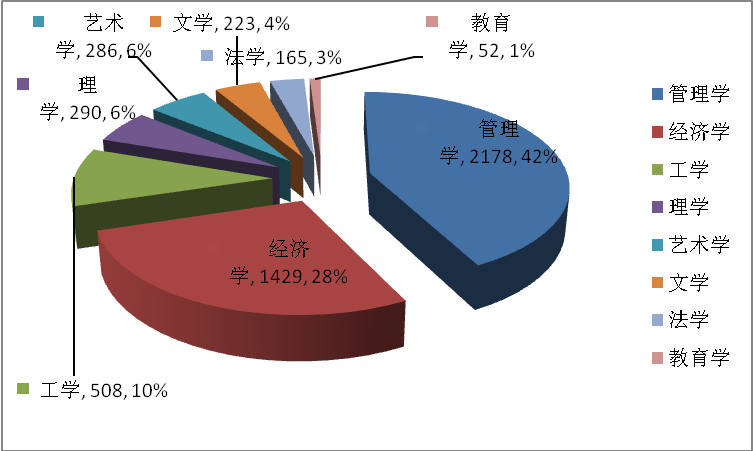 我校2014届普通本科毕业生专业分布在8个学科门类,其中管理学和经济学类人数最多,分别占比42%(2178人)和28%(1429人)。(见图2.1)