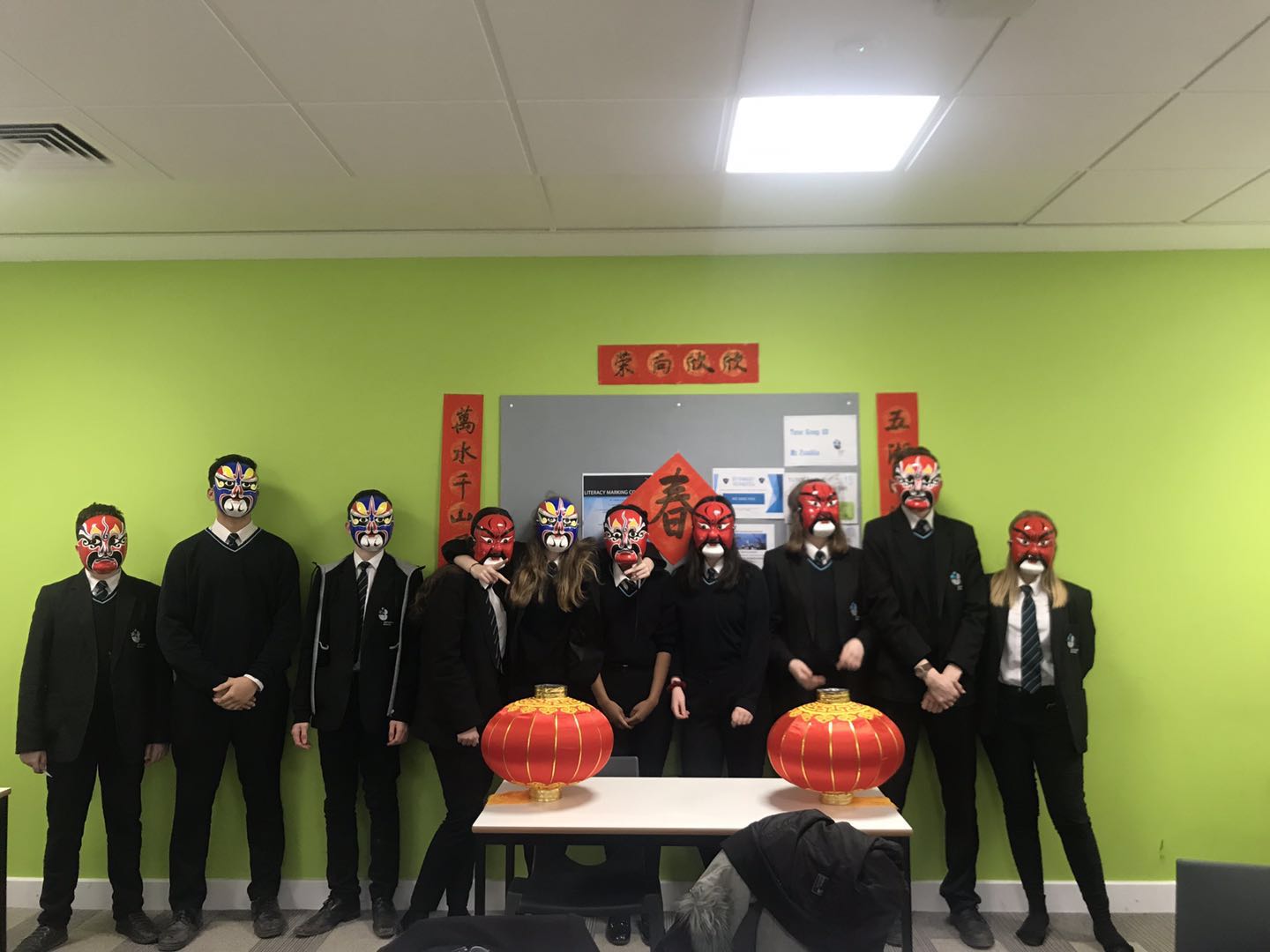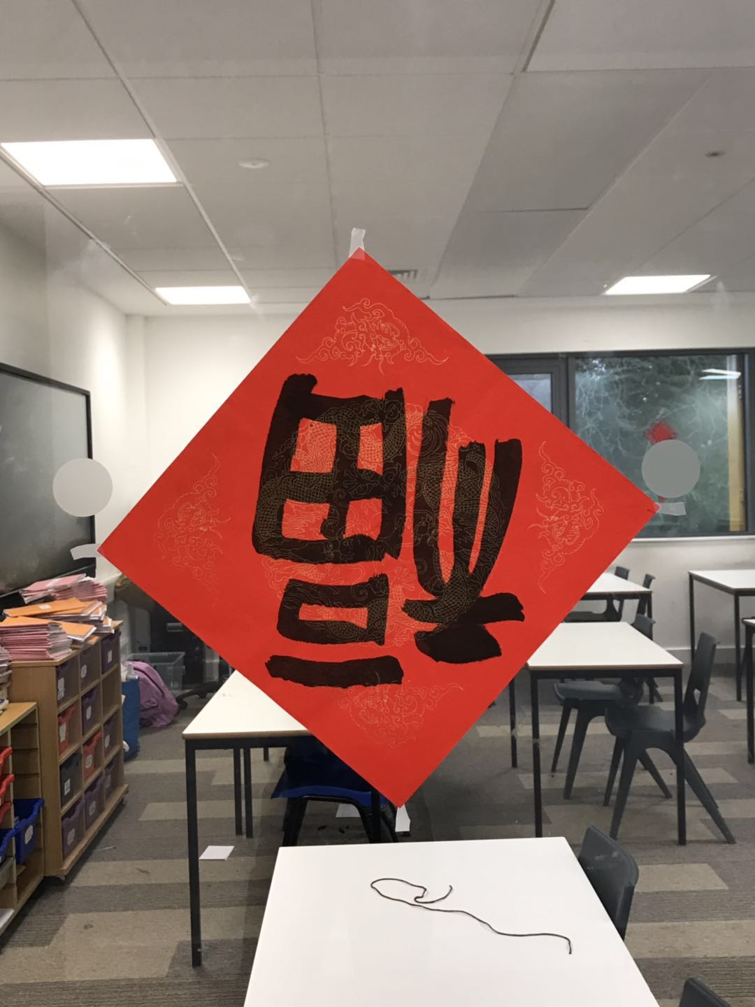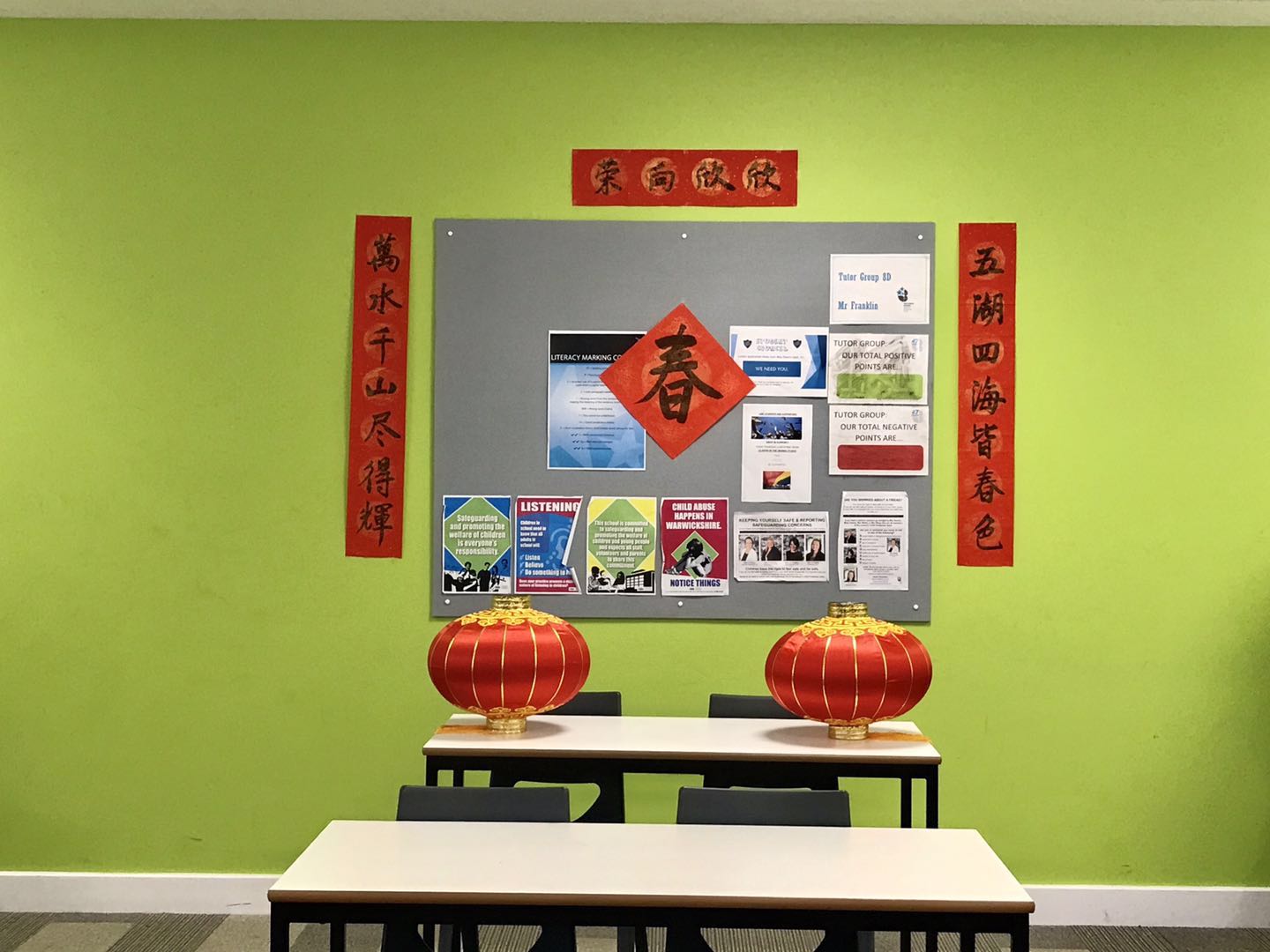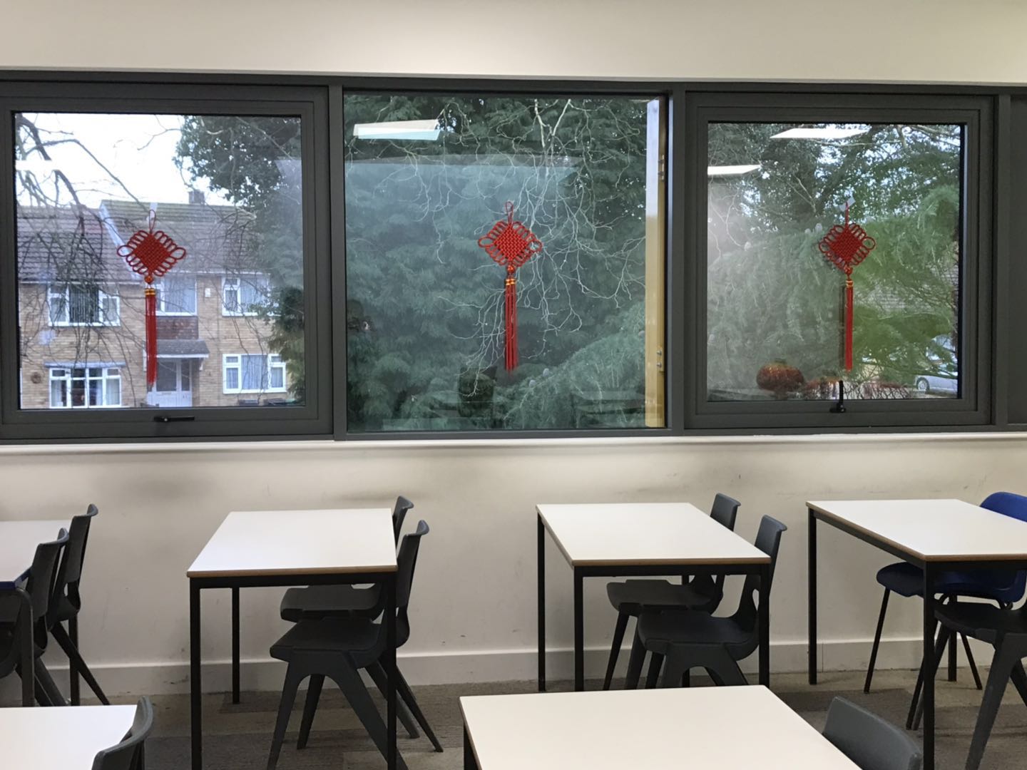 2月5日,大年初一。任一鸣老师和康青霞老师来到了AshgreenSchool上课。AshgreenSchool位于考文垂市郊,是考文垂大学孔子学院2019年的“新伙伴”,这是他们的第三节课汉语课。为了让学生感受春节文化和氛围,上课前,两位老师在教室门口和教室内部贴上了春联,挂上了中国节和灯笼,对面教室的孩子们忍不住往门上看几眼。下课铃声一响,对面教室的学生围成一群,“Howlovely!”“What’sthat?”……两三个女孩子走过来,睁着好奇的大眼睛,问:“Hi,Miss,whydidyoudecoratetheclassroom?”任老师微笑着向他们介绍了春节。上课铃响了,汉语班的学生们进来了,眼前一亮,对于自己的“新教室”欣喜不已。
