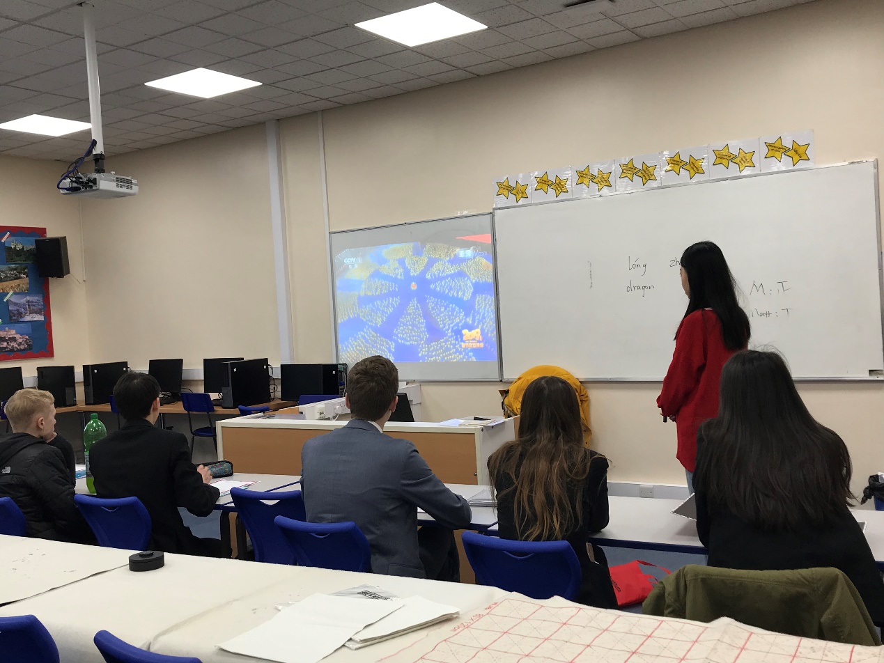 大年初四,陈彦冰老师和康青霞老师来到了BablackSchool。BablakeSchool是考文垂市颇有名望的私立学校,2018年10月初设汉语课,由陈彦冰老师担任课后汉语文化兴趣班教学。陈老师在通过视频介绍春节之后,对学生们进行了提问。经过一个学期的学习,学生们已经是小小的“中国通”,都回答出了正确答案。在介绍“春节联欢晚会”之后,陈老师为学生播放了春晚的武术表演《少林魂》,Alex很快就认出了表演者们排列组合成的“福”字。接下来,康老师带领学生们书写“春”字和“福”字。