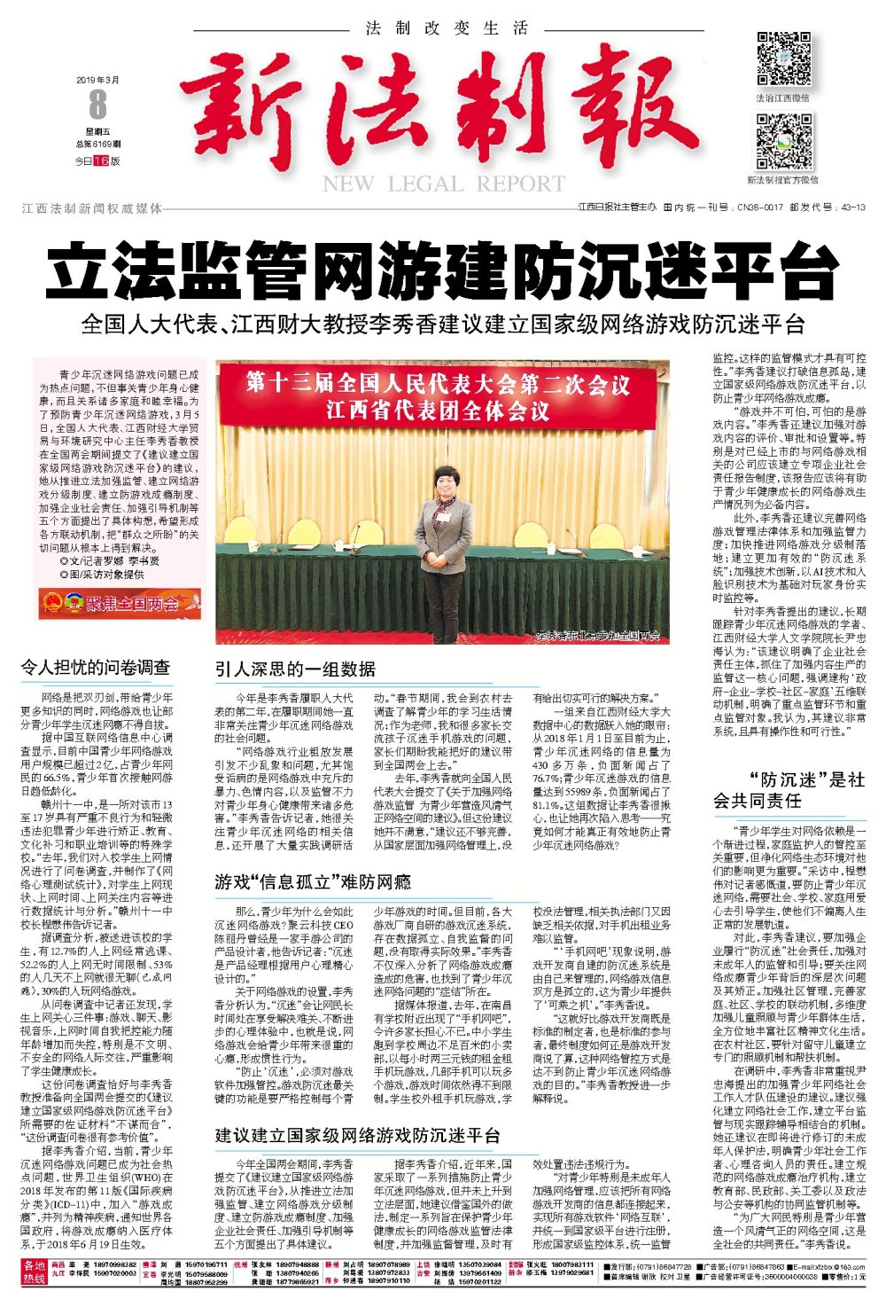 青少年沉迷网络游戏问题已成为热点问题,不但事关青少年身心健康,而且关系诸多家庭和睦幸福。为了预防青少年沉迷网络游戏,3月5日,全国人大代表、我校贸易与环境研究中心主任李秀香教授在全国两会期间提交了《建议建立国家级网络游戏防沉迷平台》的建议,她从推进立法加强监管、建立网络游戏分级制度、建立防游戏成瘾制度、加强企业社会责任、加强引导机制等五个方面提出了具体构想,希望形成各方联动机制,把“群众之所盼”的关切问题从根本上得到解决。近日,《新法制报》对李秀香教授进行了专访,3月8日以题为《立法监管网游建防沉迷平台》在《新法制报》头版进行专题报道。全文如下: