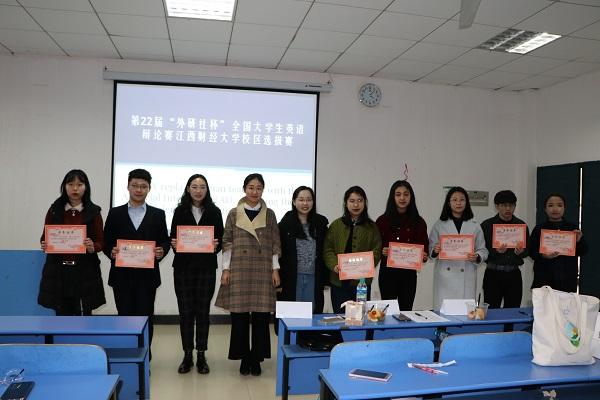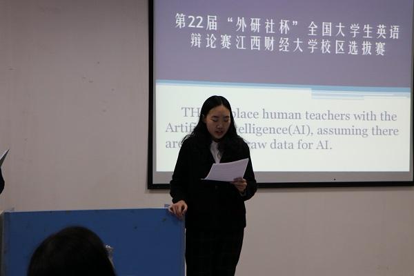3月13日下午,由外国语学院学生会学习部承办的第22届“外研社杯”全国大学生英语辩论赛江西财经大学校选赛决赛于英庐Y117热烈开展。本次比赛由外国语学院张晗老师、曾文君老师和曾获BP辩论赛地区赛二等奖,全国赛三等奖的国际学院徐天馨担任评委,他们对辩手的表现进行了严格的打分并且就辩手在答辩中存在的问题给出了建议与指导。