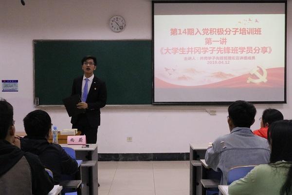 为进一步加强对入党积极分子队伍建设的需要,向我党推选出一批优秀合格的发展对象,国际经贸学院分党校第十四期入党积极分子培训班第一课于4月12日开讲。本次活动有幸请来井冈先锋班的几名优秀代表做宣讲,他们分别是来自国贸学院的尚蔚同学、会计学院的孙泽广同学、国际学院的崔玉琼同学和信管学院的张成旺同学。