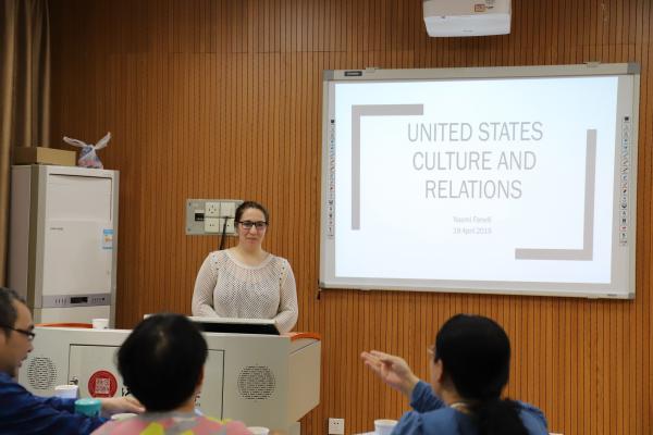 接下来,通过中美文化维度对比图,可以了解到中美之间的种种差异,例如在创业方面,美国人为风险偏好型,中国人为风险规避型;美国人更加注重短期效益,而中国人更偏向于细水长流式收益;美国青年相比之下更加独立等。NaomiFanelli又从假期、婚礼、运动、饮食、发明、品牌等多个方面向大家介绍美国文化,在场的老师也纷纷分享中国的婚礼饮食习惯以及与美国产品的故事。