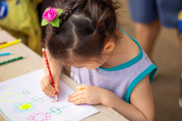 9时整,活动准时开始。志愿者一声令下,大家难抑心中的激动,纷纷小跑起来。在蛟湖畔,大家找到了第一个打卡点。志愿者们给孩子们留下了任务——发挥想象力,创作一幅画。孩子们跃跃欲试,纷纷伸出小手抓起画笔,在纸上涂鸦起来——跃出山脊的彩虹、简笔白描的蛟湖风光、稚嫩又不失温暖的“I♡JUFE”,纷纷从童心化为纸上缤纷的色彩。一幅幅画作完成后,志愿者细心地将它们夹好,挂在一旁的细绳上,笔触童心可掬,饶有趣味。