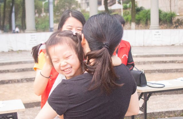 在阵阵轻松的音乐中,孩子们三五成群嬉戏追跑,笑声、闹声不绝于耳;不远处,参加活动的教职工们或与自己的孩子一同玩耍,或与他人轻松地交谈。来自人文学院社会工作专业的学生志愿者们正在为参加活动的家庭进行抽签、登记等准备工作。