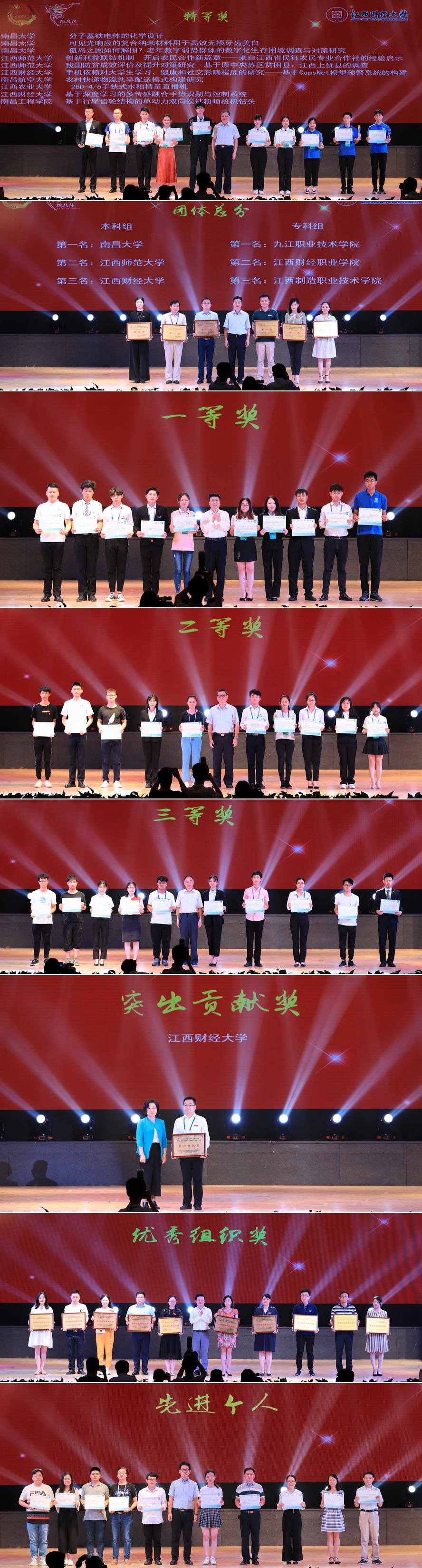经过资格审查、省级复赛、现场问辩、决赛答辩和组委会、评委会联席会议综合审定,本次大赛最终评出特等奖作品10件、一等奖作品30件、二等奖作品共计90件、三等奖作品共计231件;南昌大学、江西师范大学、江西财经大学荣获“本科组团体总分前三名”,九江职业技术学院、江西财经职业学院、江西制造职业技术学院荣获“高职专科组团体总分前三名”;江西财经大学获得突出贡献奖;南昌大学等22所高校获得“优秀组织奖”;谢亮等30位同志获得“先进个人”。