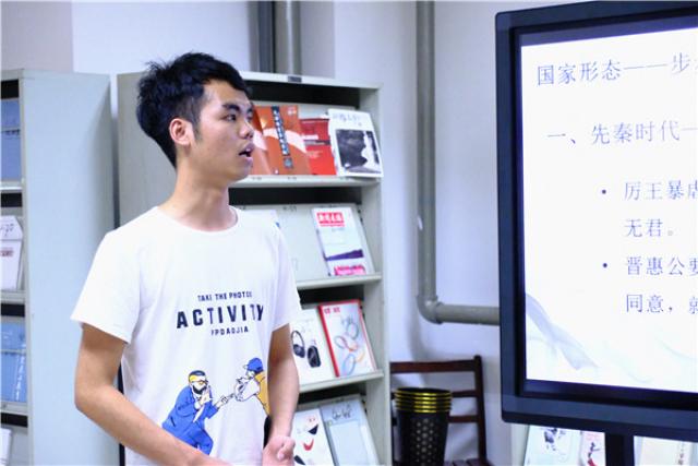 汪仕友同学的报告分为三个部分:“走向专制的国家形态”、“近代的幻想”及“从传统文化中寻找现代文明病的解药。”在第一部分,他按照从先秦到明清的历史脉络,阐述了古代中国是如何从民主走向专制主义。先秦时期,君权、贵族权与平民权三权鼎立,相互制衡;秦汉时代,商鞅变法对贵族和平民均造成了一定打击,使得君权得以加强;西汉吸取了秦灭亡的教训,推行“推恩令”削弱贵族;魏晋南北朝时期对世族的拥戴致使贵族权力到达顶峰。历史的车轮滚滚向前,来到隋唐。隋文帝收天下兵器,推愚民政策,逐渐探索出协调阶级关系的统治道路。在明清,朱元璋废除宰相,设立锦衣卫、东厂,使专制集权达到前所未有的高度。