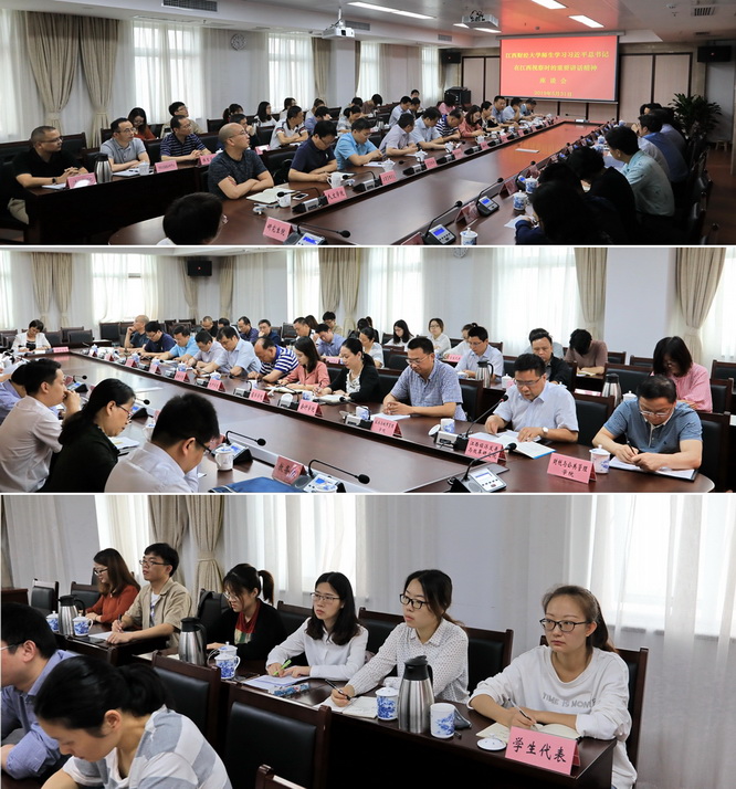 座谈会首先播放了习近平总书记在江西视察的新闻视频,与会人员认真观看学习并做了记录。在随后举行的座谈会上,经济学院、金融学院、信息管理学院、旅游与城市管理学院、人文学院、江西经济发展与改革研究院、协同创新中心等学院和科研机构负责人进行了发言交流。他们结合习近平总书记重要讲话精神和各自领域工作及专业知识谈了看法和建议。