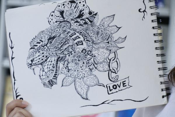 在讲解过程中,牟容葶同学上台展示了她本人的画作,并讲解了她的创作理念与内心感悟。尹忠海教授、许新港同学通过对牟容葶画作的解读,进一步帮助大家理解创作者的抽象概念与艺术品的具体表现形式之间的关系。