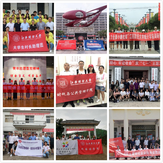 暑期“三下乡”村长助理服务团前往江西省九江市武宁县泉口镇开展暑期社会实践活动,旨在帮助当代大学生在生动的社会实践中切实感受祖国的发展变化,升华爱国情怀,培养有理想、有本领、有担当的新时代青年。大学生传媒联盟历史成就观察团深入江西省南昌市进贤县衙前乡,开展以“青春心向党建功新时代”为主题的一系列活动。财税与公共管理学院红扬社、会计学院益行实践团队员们在灵丘县了解当地经济状况、旅游业发展状况、扶贫工作开展状况、居民生活状况。金融学院暑期“三下乡”走进黑龙江共青农场,从绿色金融的角度出发,重点考察了共青农场产业化背后金融支持的规模与效果,为探索绿色金融支持农业绿色发展的新模式提供参考。统计学院调研服务队兵分三路:“青春助力小康--农村交通基础设施建设调研”队考察农村交通基础设施建设;“水污染现状调查与分析”队实地访谈农户,了解农村水污染情况;“情暖童心,大手牵小手”调研队关注农村留守儿童问题,建立帮扶联系。经济学院泰和调研队前往吉安市泰和县各乡镇开展暑期专业实训活动,重点考察了各地乡村振兴的模式、产业扶贫项目及成效、村民土地流转、乡村振兴的资金支持及农村产业转型等。旅游与城市管理学院村支规划志愿服务队来到九江梅棠镇新庄村进行调研,通过当地土地现状图,对比实际情况,向村民了解了很多村子内部的情况等方式完成一系列调查问卷等工作。外国语学院“外征兴乡,语婺逐源”走进婺源县冲田村村委会,访谈村委会委员,转述民意,询问对策。人文学院脱贫攻坚小组来到高田乡,发挥出人文学院所设学科的优势,为推广普通话起到实在的推动作用。国际学院暑期“三下乡”社会实践营队奔赴井冈山市,通过实地走访调研助力脱贫攻坚。