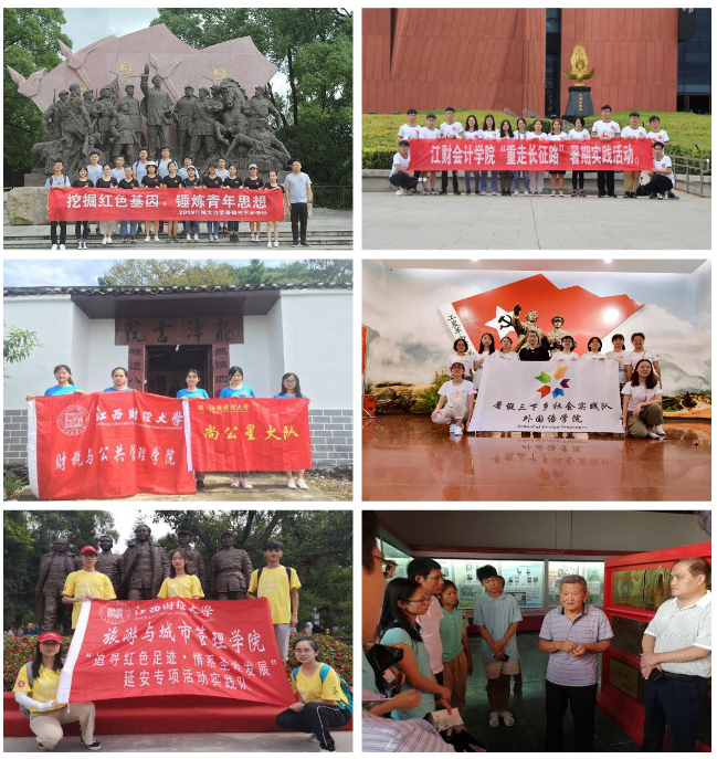 大自委新时代青年思想调研团前往古田会议纪念馆、毛泽东纪念园、龙岩市博物馆、才溪乡,一路追寻红色足迹,探求闽西红色文化在新时代下的价值体现。会计学院暑期“三下乡”重走长征路历史观察团前往云南省博物馆、云南陆军讲武堂、石鼓渡红色纪念馆学习参观,寻访云南历史,体会文化精神。财税学院尚公星火队来到新城镇,参观革命旧址,感悟红色文化的;考察万亩猕猴桃基地,充分发掘井冈山周边地区发展潜力。旅游与城市管理学院延安专项实践队赴枣园追随红色足迹,重温那段艰苦而峥嵘的革命岁月。外国语学院“三下乡”修水团队通过参观秋收起义纪念馆和其他革命旧址,重温红色记忆,坚定前行信念,牢记时代使命,弘扬红色文化。赣州团队则通过重走长征路、体验红军生活、访谈苏区人民、诵读誊写红色家书,充分汲取了红色家书中的精神食粮。体育学院暑期三下乡志愿服务队来到茌平县袁楼党史纪念馆、聊城市革命烈士纪念馆进行参观学习,深刻缅怀为革命抛头颅、洒热血的先烈志士。