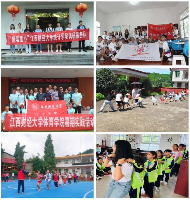 工商青协乡村夏令营桂馨团队在大亭中心校开展桂馨“悦”读周夏令营活动,志愿者队全力以赴,为大山的孩子们带来一次奇妙而趣味的夏令营之旅。春晖筑梦支教服务队在贵州省安顺市镇宁县白马湖街道大新小学开展了以“拥抱阳光,拥抱成长”为主题的趣味运动会活动。统计学院“情暖童心”调研服务队来到江西省新余市仙女湖区钤阳办事处白田村,通过访谈村委干部、深入农户进行实地走访等方式,就留守儿童的心理和教育问题开展调研。金融学院彩虹社会实践服务队的志愿者们与贵州省罗甸县逢亭小学的孩子们一起进行了“颜色+情绪”“颜色+品质”、“颜色+戏剧、“颜色+诗词”、“色彩+魔力”的主题活动。国际经贸学院赴景德镇浮梁县暑期志愿服务队前往浮梁县湘湖镇敬老院进行志愿服务活动,为敬老院的老人在夏日里送去一份清凉和关爱。企业管理协会暑期三下乡团队在上饶市铅山县葛仙山村下际小学举行了趣味运动会,丰富学生课外生活,感受体育运动魅力,增强学生凝聚力。体育学院暑期“三下乡”社会实践志愿服务队赴聊城市茌平聋哑儿童特护学校开展志愿帮扶活动。