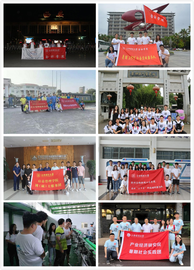 会计学院“一带一路”调研实践队在西安研究“一带一路”中西安小微型企业投融资现状,引导江财学子在投身“一带一路”倡议的生动实践中成长成才,同时为国家一带一路发展提供丰富的实践材料与相关信息。国际经贸学院电商下乡服务实践队深入到景德镇雕塑瓷厂和企业,围绕“助力精准扶贫,服务乡村战略”的主题,通过对浮梁县陶瓷工艺品销售基地进行访问调研,以及走访当地的民间陶瓷工艺品大师,进一步加强对浮梁县陶瓷工艺品产销现状和发展成果的了解,分析并挖掘其潜在的问题,寻找电商扶贫的新思路、新模式。信息管理学院博硕士服务团赴景德镇市深度访谈了景德镇市的四家知名企业,了解企业“两化融合”现状,分析目前企业“两化融合”中存在的问题,为企业实现信息化与工业深度融合和企业转型升级提供合理的对策建议。软件学院科技调研服务队赴吉安井冈山经济技术开发区,相继走访了木林森公司和合力泰科技股份有限公司,完成了关于“传统企业互联网转型”和“企业生态创新”的调研任务。产业经济研究院实践团走访多家鹰潭企业,对鹰潭市传统铜产业和现代物联网产业有了一定的了解。