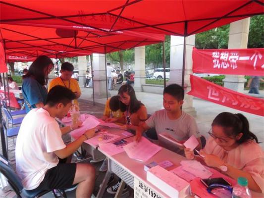 来自法学院182班的余秋霞已经在岗位忙了一天了,她主要负责的工作内容是带领新生们办理保险、领取宿舍钥匙、水卡、军训服等必需品。她奔波在不同的办事点,汗水不断地滑落,虽然很疲惫,但是她依然以笑容迎接新生,并耐心地帮助她们办理入学相关事宜。余秋霞在接受采访时谈到:“迎接新生是法学院的优良传统,去年我来报道的时候也是学长学姐们热心接待我们,我感受到了法苑的温暖。今年我也想尽自己的绵薄之力,做好迎新工作。”迎新棚里除了她,还有其他七八个辛勤工作的志愿者,他们无私奉献,尽心尽力做好本职工作,给19级新生送来了法学院真挚的问候与热心的关怀。