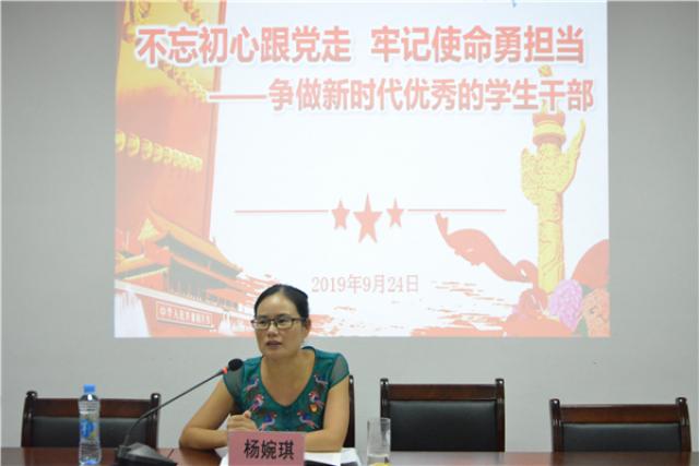 9月24日下午,信息管理学院于荟庐402会议室举行“争做新时代优秀学生干部”主题讲座。信息管理学院党委副书记杨婉琪作为主讲人围绕着“不忘初心跟党走、牢记使命勇担当”分析了信息管理学院学生会现存问题并提出了相应的解决措施,在为学生干部普及团学知识的同时指明了学生会前行方向。讲座由分团委书记李勇主持。