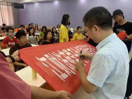 上午九时,法体楼402室内座无虚席,同学们提前到达教室等待着阅兵仪式开幕。开幕式正式开始前,同学们纷纷在鲜红的横幅上签上自己的名字,为祖国母亲的伟大生日送上了自己的一份心意。十点整,阅兵仪式正式开始,屏幕内礼炮声响彻天空,教室内也响起了雷鸣般的掌声,全场气氛也达到高潮。随后,全体同学随着国歌声一同起立,高唱国歌。法苑学子的满腔爱国热枕伴随着歌声,响彻法体楼。