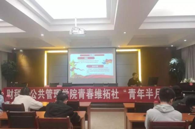 为引导广大青年学生关注时事热点,提高新时代青年学生思想政治觉悟,坚定大学生“为人民谋幸福,为中华民族谋复兴”的理想信念,高质量促进“不忘初心,牢记使命”主题教育的开展,江西财经大学财税与公共管理学院青春维拓社紧跟时代发展,于11月3日晚在蛟桥财税大楼一楼会议室开展了本学期第一期青年半月谈。本期青年半月谈邀请到财税与公共管理学院学生第一党支部副书记杨杰同学为同学们深入解读十九届四中全会公报。