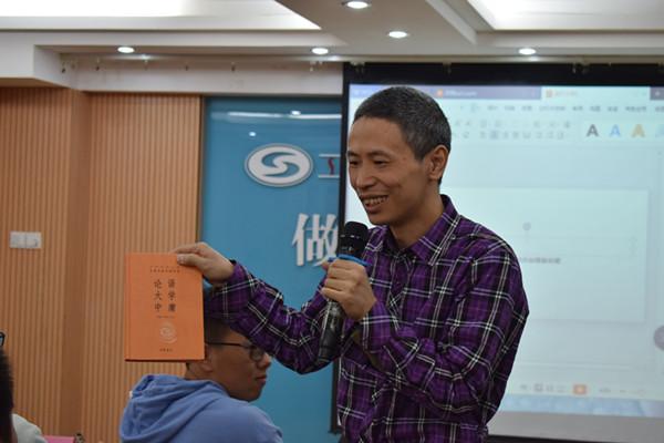 活动在全体起立共唱团歌的歌声中正式拉开了序幕,主持人介绍主讲人、嘉宾及活动详情后,钟尉娓娓道来他对传统文化的看法与理解。他先拆分“君子”二字得到其内涵:受人尊敬的领导,以切入讲坛主题,调动现场氛围。接着,钟尉讲述他多年来熟读《论语》的感悟,他认为《论语》之绝妙在“论”字上便有体现,“论”字去掉言字旁后既“仑”,“仑”本意顺序,寓意整部论语井然有序。