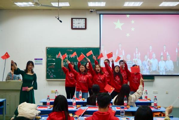 “全世界都在说中国话……”,班会在歌曲《中国话》的悠扬旋律中拉开了序幕。七十年斗转星移,随着改革开放的不断深入发展,中国走向世界,中国话乃至中国文化也跨出国门,引领时代发展。南腔北调中国话,国富民强盛世歌。在优美动听的歌声以及整齐划一的动作中,同学们惊叹中国文化的博大精深、中国汉语的抑扬顿挫以及中国发展的日新月异。“我和我的祖国,一刻也不能分割……”,紧接着,大合唱《我和我的祖国》的歌声在教室里回荡。中国,在历史的变迁中腾飞,每一个中国人,所经历的苦与乐都与祖国奋发图强的发展密不可分,都与时代铿锵有力的脚步息息相关。“我和我的祖国,像海和浪花一朵”,同学们的歌声,仿佛让人看到了浩瀚无垠的大海上,成千上万的浪花,随着崩腾不息的大海在跳跃、在拼搏。歌曲前后旋律交相辉映,引发共鸣,现场所有观众纷纷挥动手中的小红旗,加入到合唱当中。浑厚有力的音符里,每一个节拍都跳动着一颗颗炽热赤子之心。