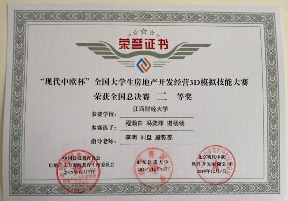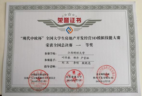 12月7-8日,由中国房地产业协会指导、中国建设教育协会主办,山东建筑大学、北京现代中欧软件开发有限公司联合承办的首届“现代中欧杯”全国大学生房地产开发经营3D模拟技能大赛全国总决赛在山东建筑大学拉开序幕。大赛自2019年4月25日启动报名以来,全国开设房地产专业的72所本科院校、35所高职院校共计1800余名学生参赛报名,经过7个多月的校内赛、区域赛的层层选拔,全国共计31所院校55支队伍进入全国总决赛。最终,我校旅城学院选派的两支参赛队伍均取得优异成绩:由刘旦老师、李明老师、殷乾亮老师指导的江西财大A队(队员:叶汉钦、邵丹、卢官林)获得了全国总决赛一等奖。