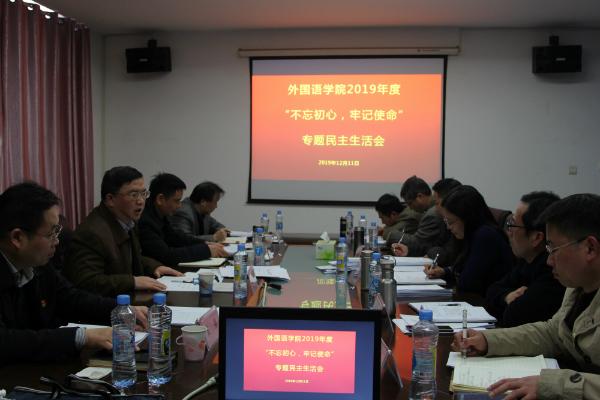 根据学校“不忘初心、牢记使命”主题教育领导小组的部署要求,12月11日下午,外国语学院党委召开“不忘初心、牢记使命”专题民主生活会。省委第十三巡回指导组副组长周世敏、指导组成员刘清涛,校党委常委、副校长袁雄,校党委常委、组织部长许基南同志到会指导。