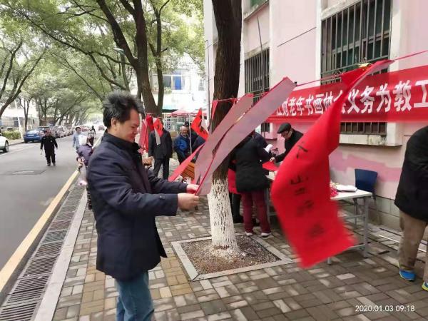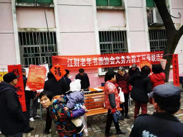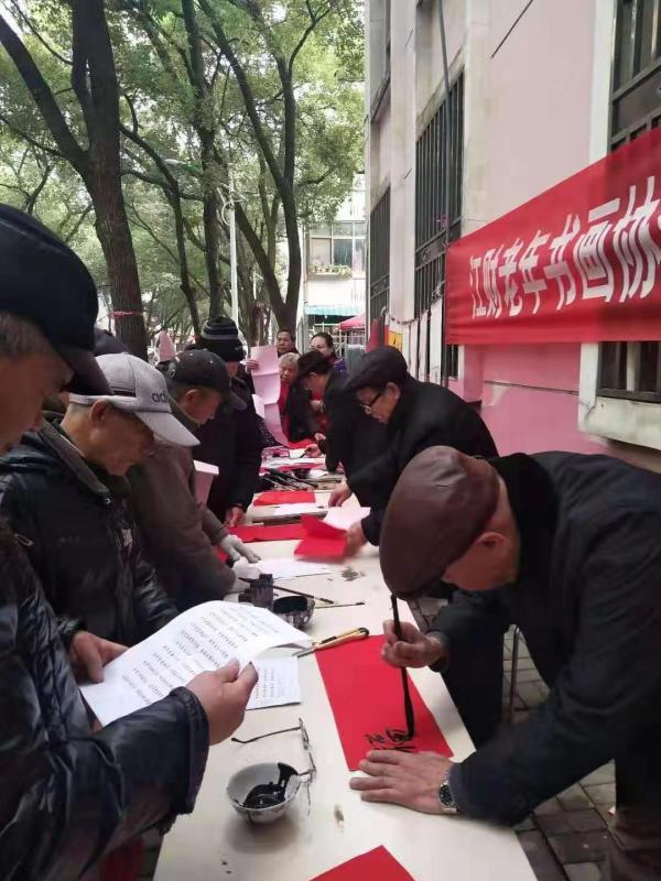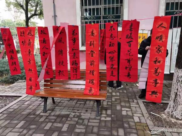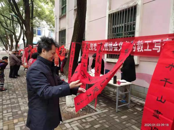 活动现场喜气祥和,离退休人员工作处处长刘仁彪亲临现场,给主笔写春联的叶梅良、余镇邦、徐军、师本亮、和协会顾问刘茶根等老同志点赞鼓励;副处长刘晓锋积极做好保障,帮助搬运桌凳,送上热茶,老年书画协会胡晓毛、黄和平、习勤、李萍,周友珍、苏惠仁、胡全安等会员分别协助为教工选送自己喜爱的对联,尽管天气寒冷,但先后来到现场的教工确越来越多,热气腾腾,由于对联数量有限,送完后,有的教工又自己拿来红纸,请会员帮助书写。本次为教工义务写春联活动,形式好,效果佳,很受教职工欢迎,许多现场人员希望年年都来送“福”字,送春联,把快乐喜庆送给千家万户!(图文/离退休人员 胡晓毛    编辑/辛宇丽)