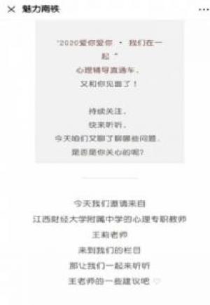 由于疫情的影响,学校无法如期开学,但是为了响应“停课不停学”,以及疏解学生们面对疫情时所产生的恐慌、焦虑等负面情绪,作为南昌市心理健康学科带头人的王莉,承担起了江西省初中心理健康线上课程审核的责任。她通过微信群,与心理健康学科授课教师们进行沟通协调,摸底了解各授课老师的背景和已有风格,反复推敲确定最后课程主题,以期为孩子们提供一堂集趣味性、互动性、知识性、有效性于一体的心理课。